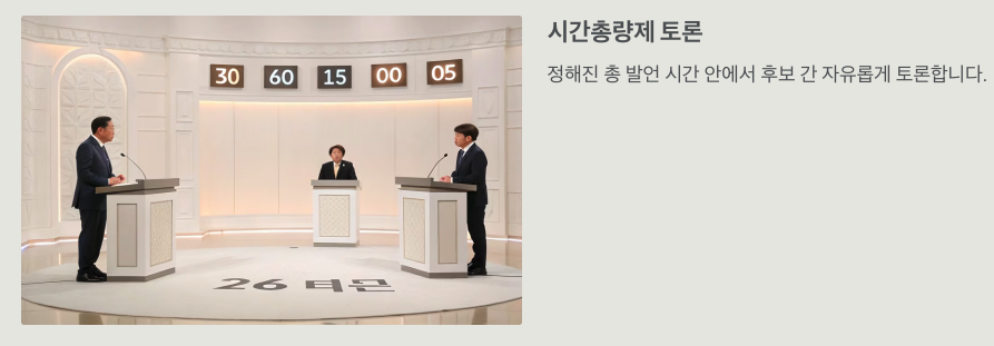 - 정해진 총 발언 시간 안에서 후보 간 자유 토론
