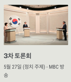 | 3차 | 5월 27일 | 정치: 양극화 해소, 개헌, 외교·안보 정책 | MBC |