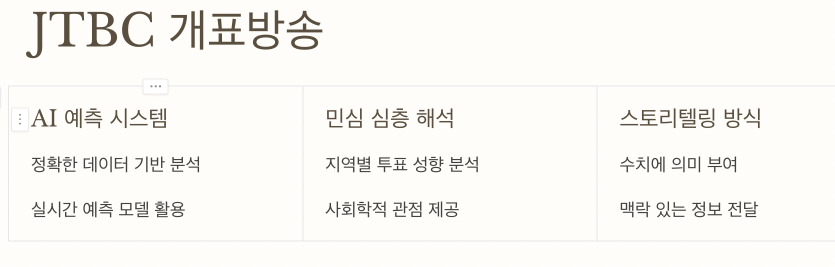 | JTBC | 젊은 감각 + 데이터 분석형 개표방송 |