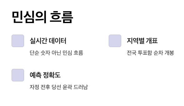 각자 원하는 방식으로 실시간 개표현황을 지켜보며, 새로운 대통령의 탄생을 함께 맞이해보세요.