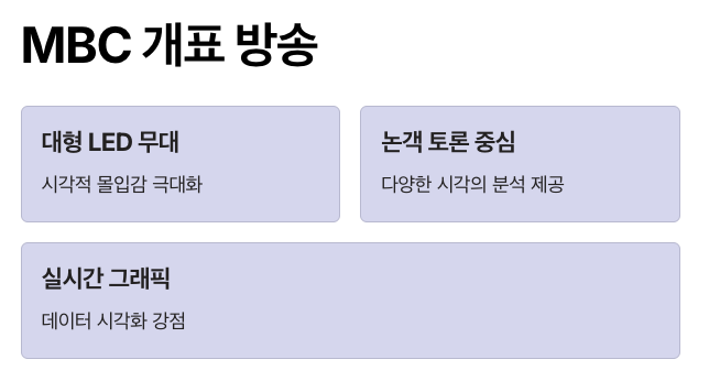 - MBC: 대형 LED 무대 + 논객 토론 중심의 실시간 개표현황