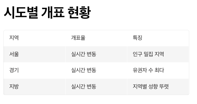 📝 이처럼 실시간 개표현황은 선거를 실시간으로 체감할 수 있는 유일한 창입니다. 정보는 무기이며, 그 무기를 제대로 읽고 활용하는 자가 결과를 예측하고, 이해하며, 다음을 준비할 수 있습니다.