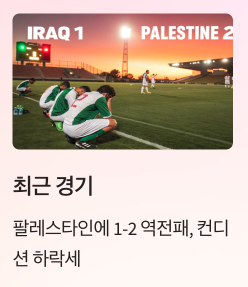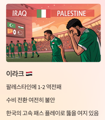 - 🇮🇶 이라크 – 팔레스타인에 1-2 역전패