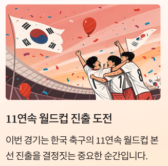 11회 연속 월드컵 본선 진출을 결정지을 수도 있는, 말 그대로 "운명의 경기"예요. 🔥